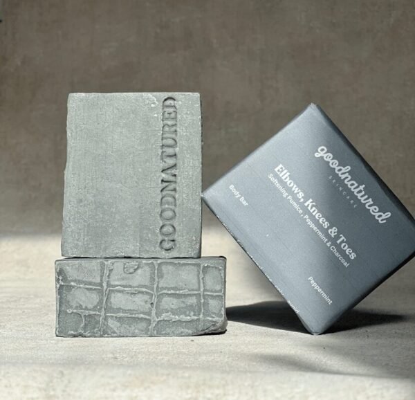 Buff and polish your dull dry skin with our exfoliating Elbows Knees & Toes pumice bar. We added a handful of pumice stone powder to our conditioning blend of oils and butters. Pumice stone powder is lightweight, and has a neutral pH, making it gentle and compatible with all skin types due to its high mineral content. Great for exfoliating and rejuvenating the skin without irritating, it lifts away dull dry skin whilst exfoliation increases blood to the skin for a natural, luminous glow. Our bar is made using fine pumice powder which is excellent at removing hard, rough skin from hands, feet, elbows, and knees. Scented with herbatiously delightful and cooling Peppermint, which contains potent anti-bacterial and anti-inflammatory properties to keep skin smelling fresh, feeling cool and fungus-free. The sprinkling of activated charcoal in the bar further helps to detox the skin, making it an essential part of your weekly Sunday reset foot care routine.
